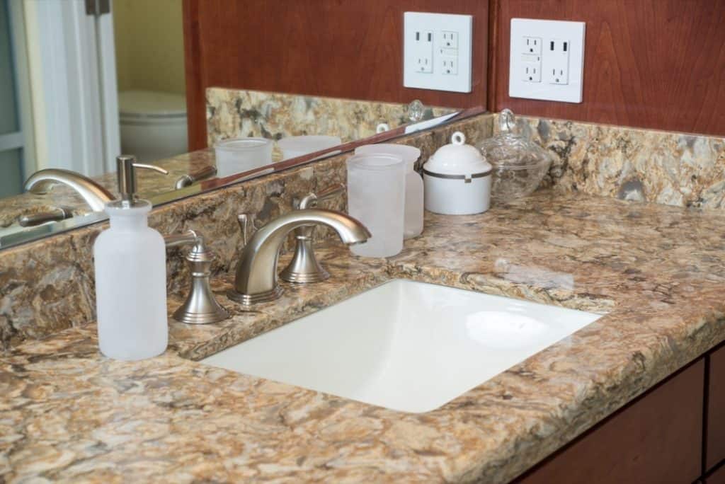 - Corian – If you want your countertop to match a specific color in your bathroom or kitchen theme, Corian, trademarked by DuPont™ , is a material that will give you the best chance of achieving that. Why? Because it’s a solid surface plastic material that that can be pigmented to almost any color you’re looking for. And it can also be made with a granite or a marble effect finish. Another pro to Corian is that because it’s not a natural material, it can be produced in large sheets and provide a completely solid countertop free of seams and joins. The drawbacks? Well, Corian is easy to clean but it’s not quite as durable as stone countertops. It can be scorched by flame, and burned by hot pans unlike some genuine stones. However, for what it costs, corian is a good, durable countertop.